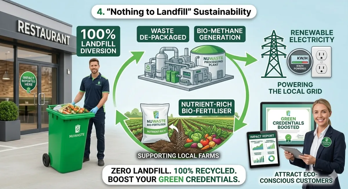 NuWaste ensures 100% of food waste is diverted from landfill. It is transformed into renewable energy (powering the National Grid) and nutrient-rich bio-fertiliser used to grow more crops.