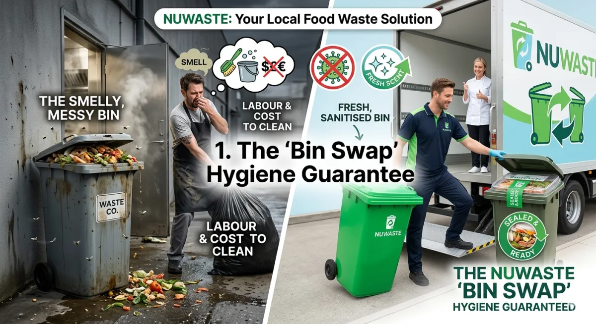 NuWaste won’t just empty bins; we’ll replace them. When we collect your food waste, we’ll swap your full container for a fresh, sanitised bin.